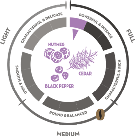Um café intenso com notas marcantes de cedro e noz-moscada, realçadas por um toque de pimenta-preta. Um café sutil com uma paleta de sabores extremamente rica. Perfeito para os amantes de um cappuccino, expresso ou ristretto muito encorpado.